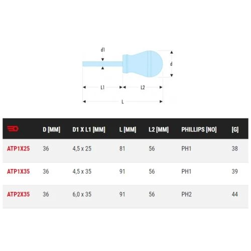 Les tournevis Protwist® pour vis cruciformes Phillips® ATP disposent d’une lame ronde courte et d’une manche boule pour les travaux à dégagement limité. Sa manche Soft Grip résistante aux produits chimiques procure à l’utilisateur un travail plus confortable.