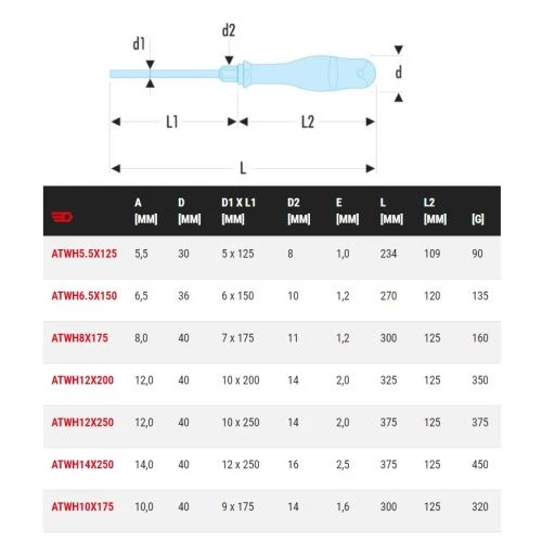 Le tournevis Protwist® pour vis à fentes série puissance ATWH est conçu avec une lame hexagonale permettant les dévissages difficiles à l’aide d’une clé. De plus, la matière du manche est en Soft Grip qui offre plus de confort lors de l’utilisation. En outre, il offre une meilleure adaptation de la vis en augmentant le transfert de couple et en réduisant l’usure.